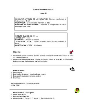 Le programme du curriculum du domaine Spirituel pour les enfants âgés de 3 à 5 ans , Année 2, comprend 46 leçons individuelles pour aider les enfants à développer spirituellement, au fur et à mesure qu’ils découvrent l’amour de Dieu, ses promesses et son plan pour leur vie à travers des récits bibliques bien connus. En fin de compte, les enfants connaîtront et comprendront les récits de base de la Bible et démontreront leur engagement envers la Seigneurie du Christ. Les leçons comprennent des histoires de l'Ancien Testament et du Nouveau Testament, qui permettent aux enfants de connaitre et comprendre l'amour de Dieu et ses promesses de la création à la résurrection. Chaque leçon comprend des instructions pour l'enseignant, y compris les préparatifs à faire, une procédure et des activités suggérées pour faciliter l'apprentissage ultérieur de manière amusante et interactive.